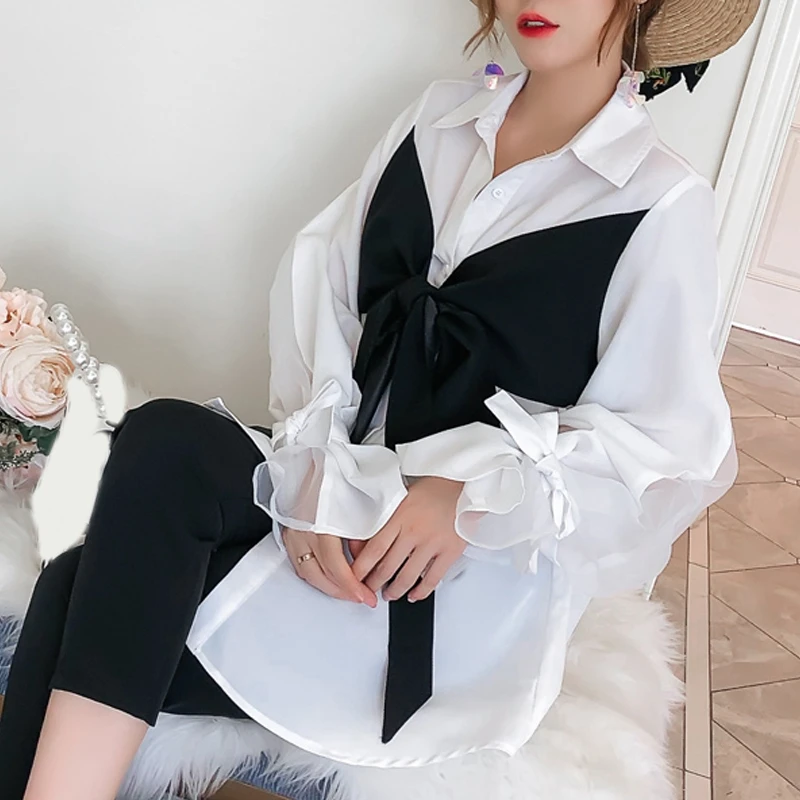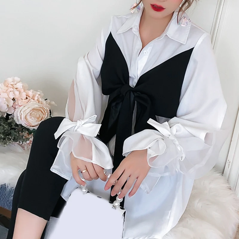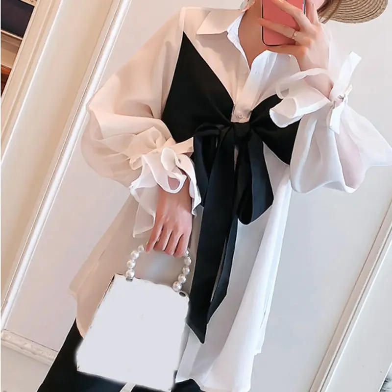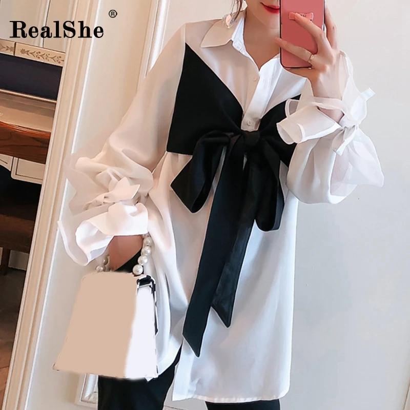 Promo RealShe Blouse Women Turn-down Collor Long Sleeve Solid Bow Ruffles Womens Tops And Blouses Spring