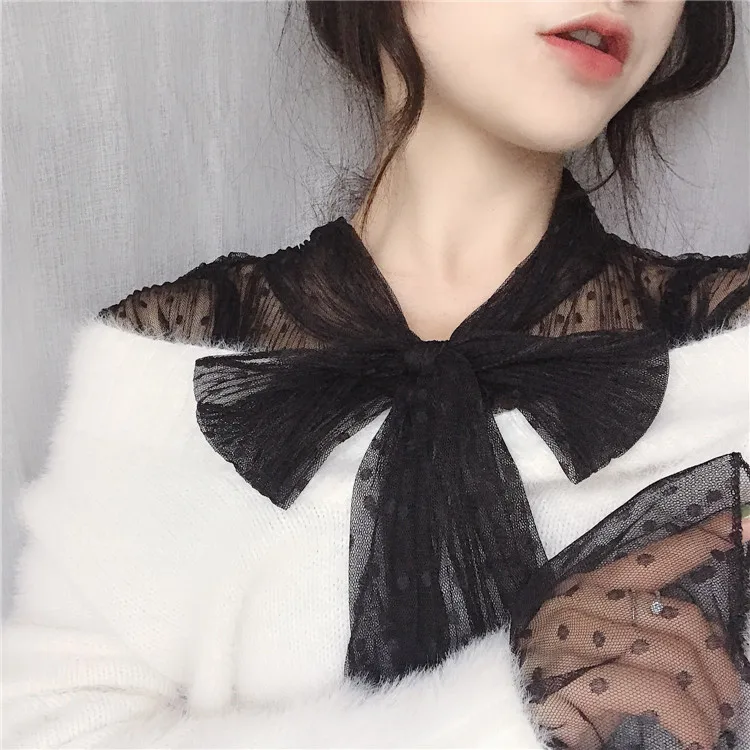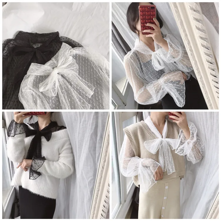 Promo Women Sexy Transparent Bow Neck Dot Mesh Tee Shirts Blouses Girls Full Flare Sleeve Tops Shirts Clo